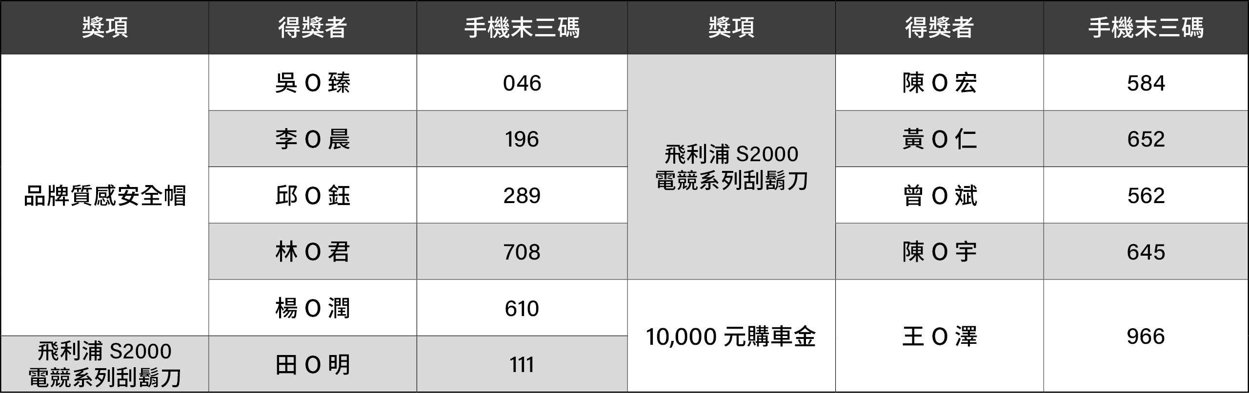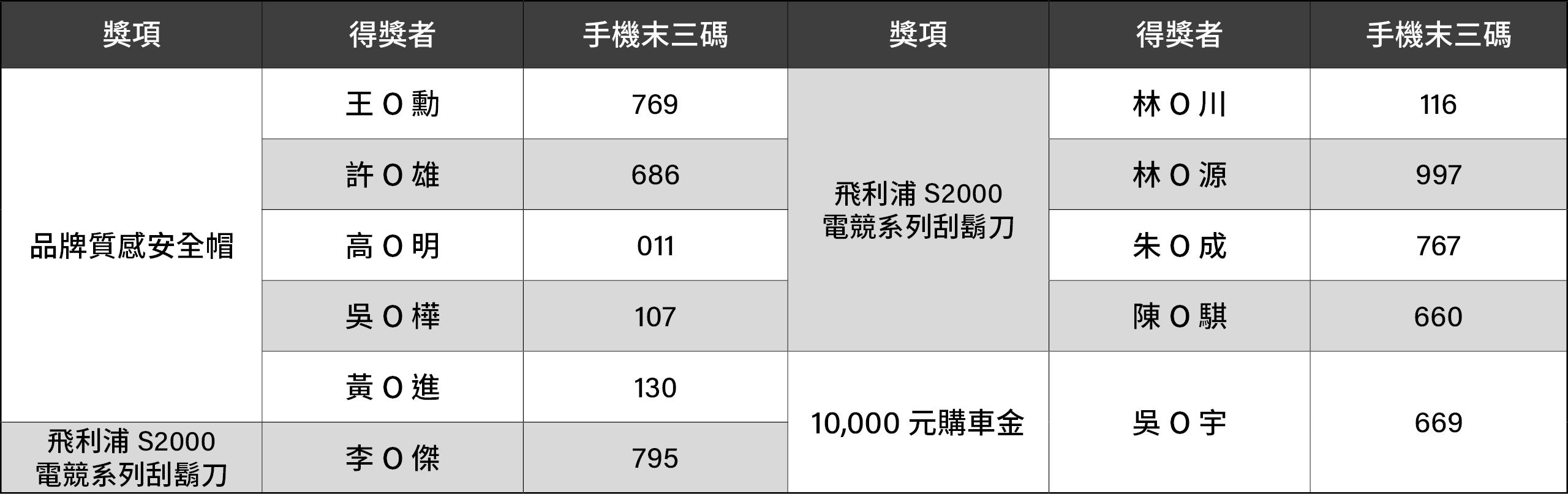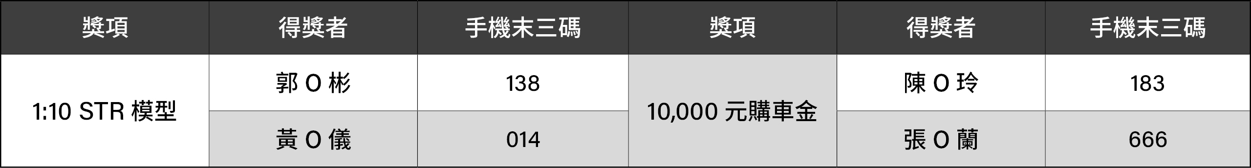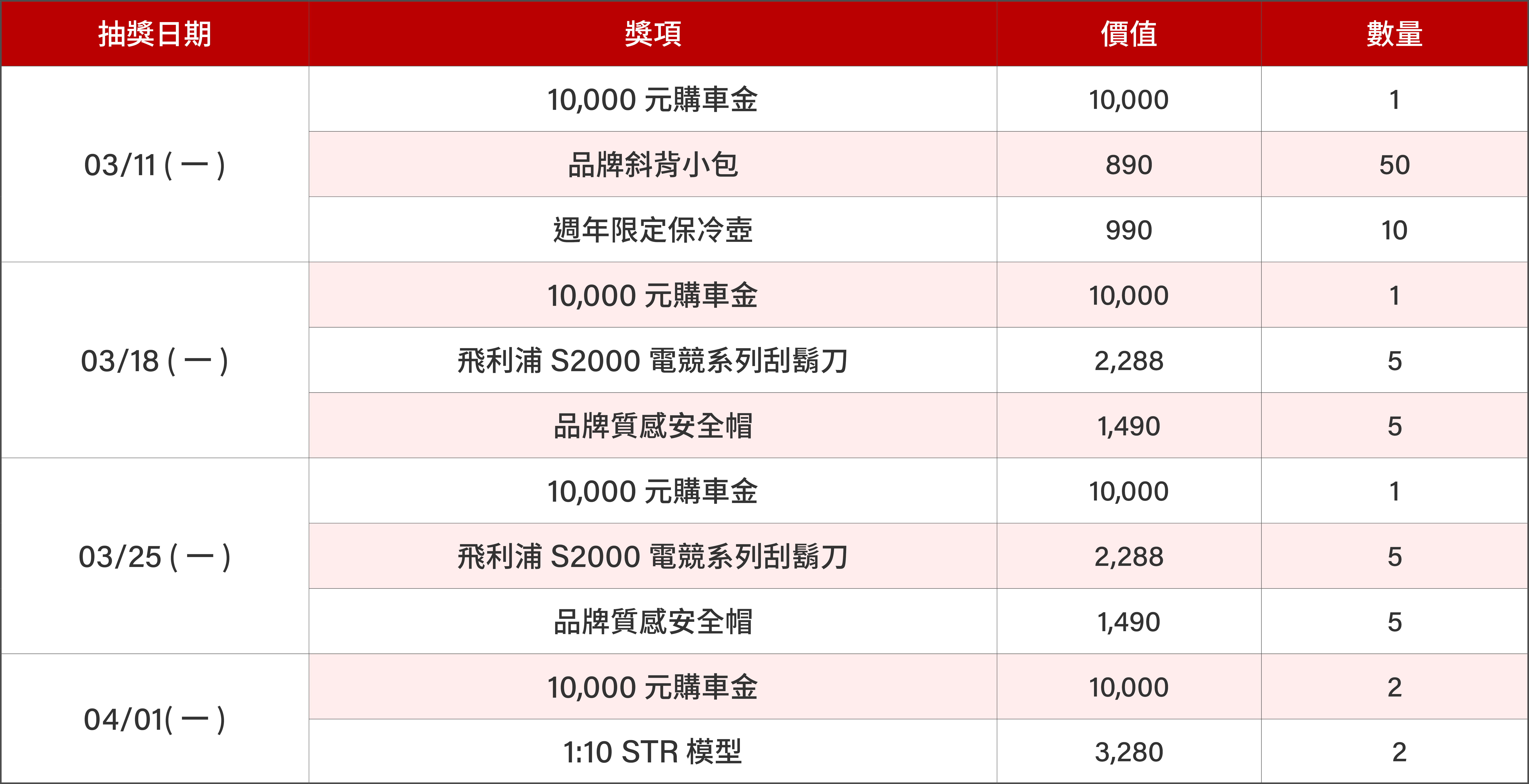 3. 好禮週週抽活動將依說明於指定日期至官網活動頁和粉絲專頁公布獲獎者。每週未中獎者得於下週重複抽獎,已中獎者不得重複抽獎,每人每車僅限參與本專案一次。