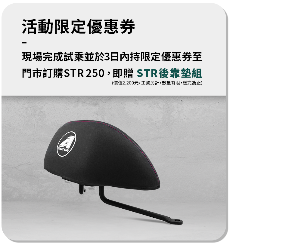1.即日起,參加人(須非法人或相關團體)參與活動後持活動限定優惠券,於活動現場、Aeonmotor門市或授權通路經銷門市購買STR 250,即可獲得「STR 後靠墊組」,(下統稱「優惠」),配送時間將由主辦單位審核後進行配送,一經查詢資格不符將取消資格不另行通知。