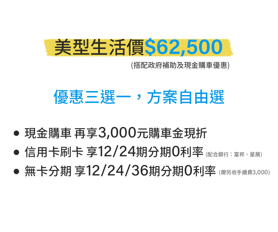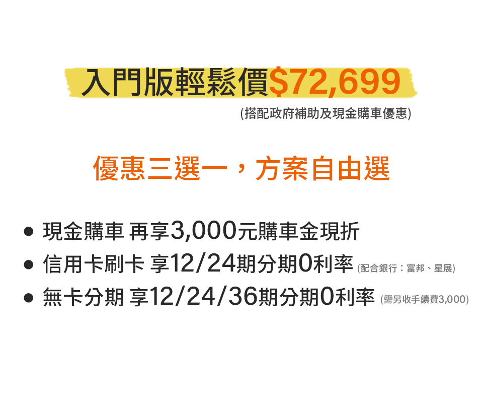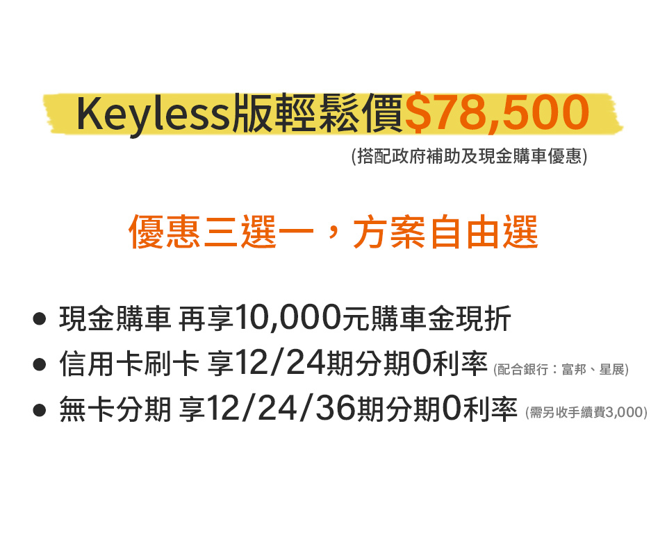 1. 即日起,參加人(須非法人或相關團體)於 Aeonmotor門市或授權通路經銷門市,購買上述指定車款可獲得本專案優惠。
