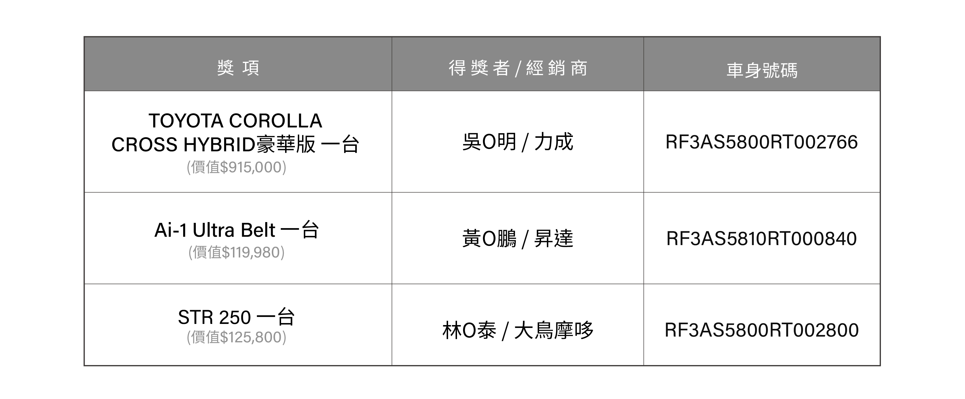 6. 大獎TOYOTA COROLLA CROSS HYBRID豪華版相關保固與品質問題與Aeonmotor無涉,請直接洽詢各地TOYOTA門市。