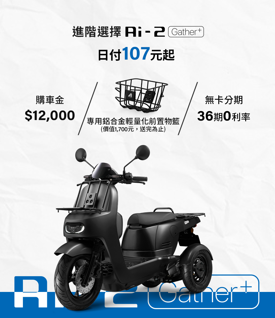 1. 參加人(須非法人或相關團體)於 2025年09月01日至2025年12月31日 (下稱「活動期間」),於 Aeontek門市或授權通路經銷門市,購買指定車款,付清全額車價(需於活動期間建立訂單並開立發票),Ai-2 Gather+可享「12,000元購車金,和專用鋁合金輕量化前置物籃乙組」,Ai-2 Gather可享「6,000元購車金」