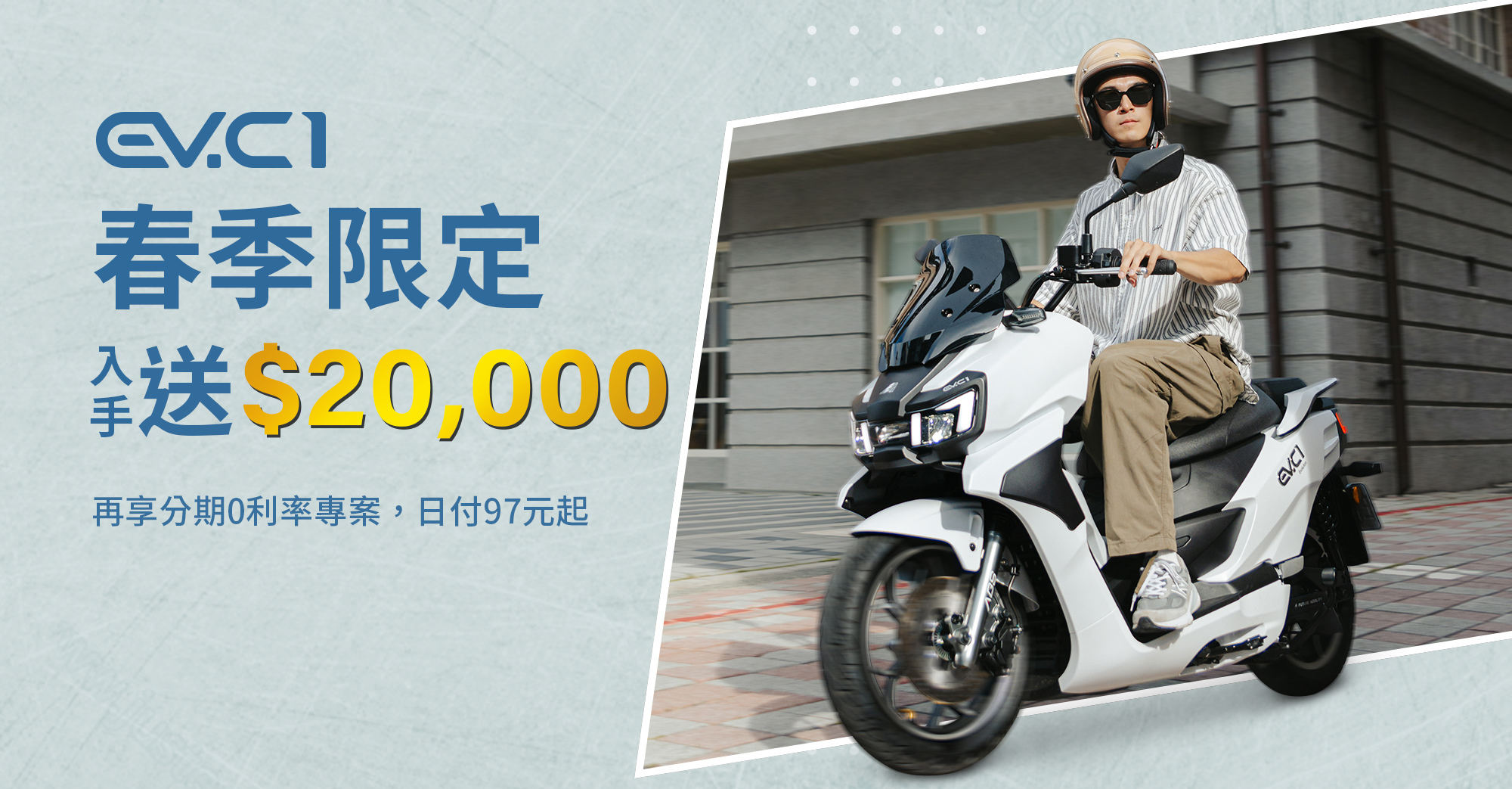 1. 參加人(須非法人或相關團體)於 2026年04月01日至2026年04月30日 (下稱「活動期間」),於 Aeontek門市或授權通路經銷門市,購買EV-C1電動機車,付清全額車價(需於活動期間建立訂單並開立發票),即可獲得20,000元購車折扣(以下稱優惠)。