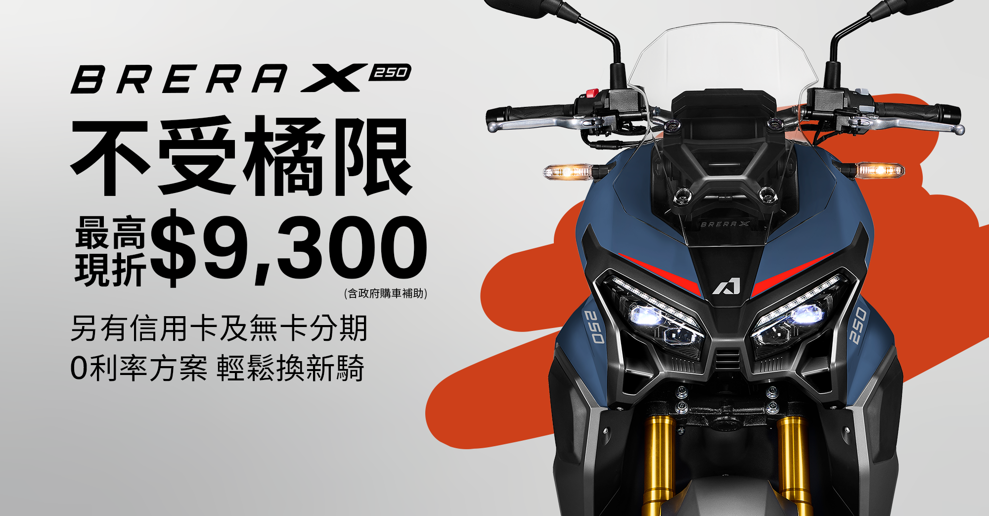 1. 2025/07/04-2025/08/31(完成領牌),參加人(須非法人或相關團體)於 Aeontek門市或授權通路經銷門市,購買Brera X 250車款可獲得本專案優惠。