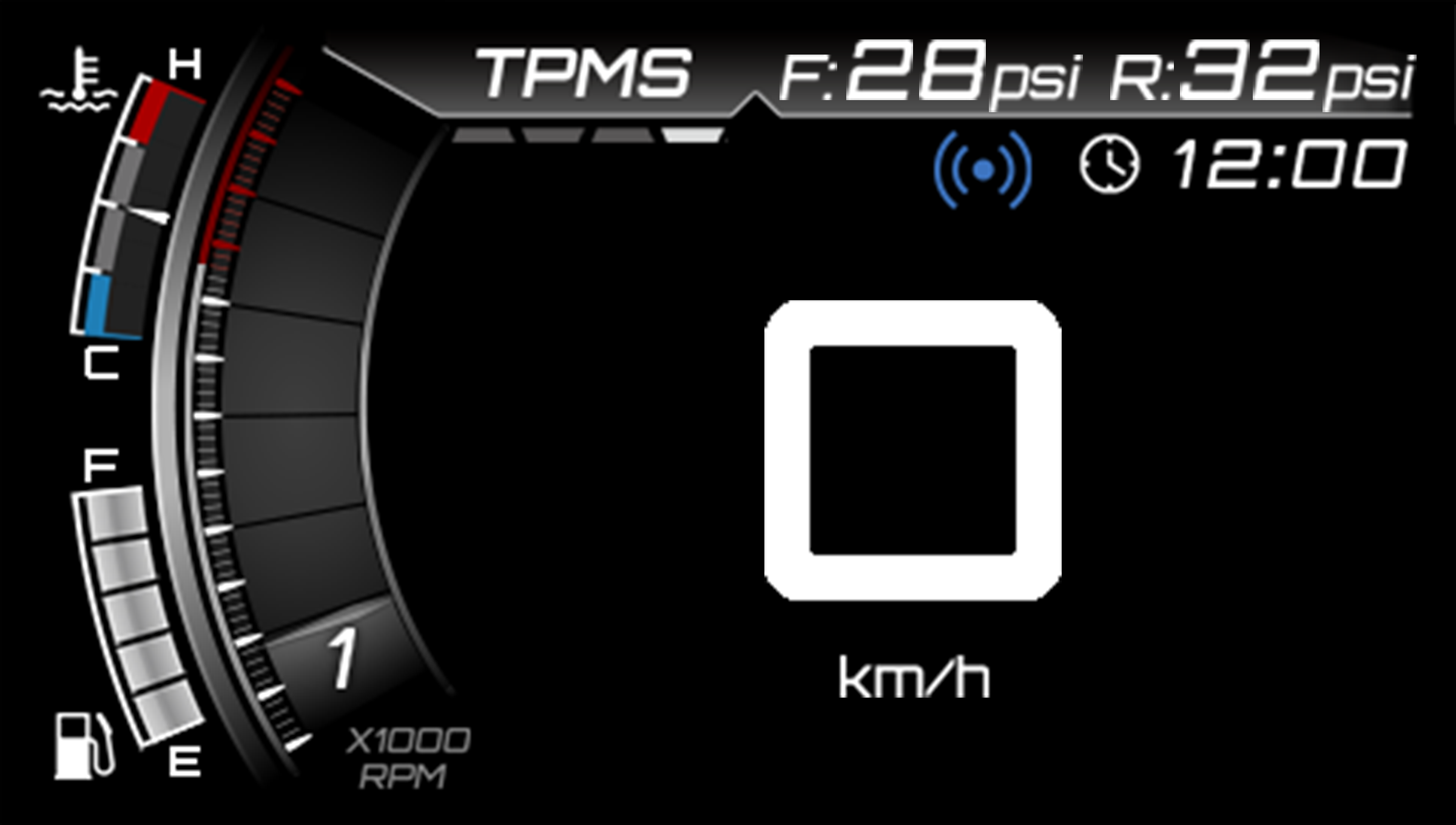 車輛為「待機模式」時,以圖為例 儀表顯示車輛與顯示胎壓為 F 28 / R 32 psi (F:前輪;R:後輪)