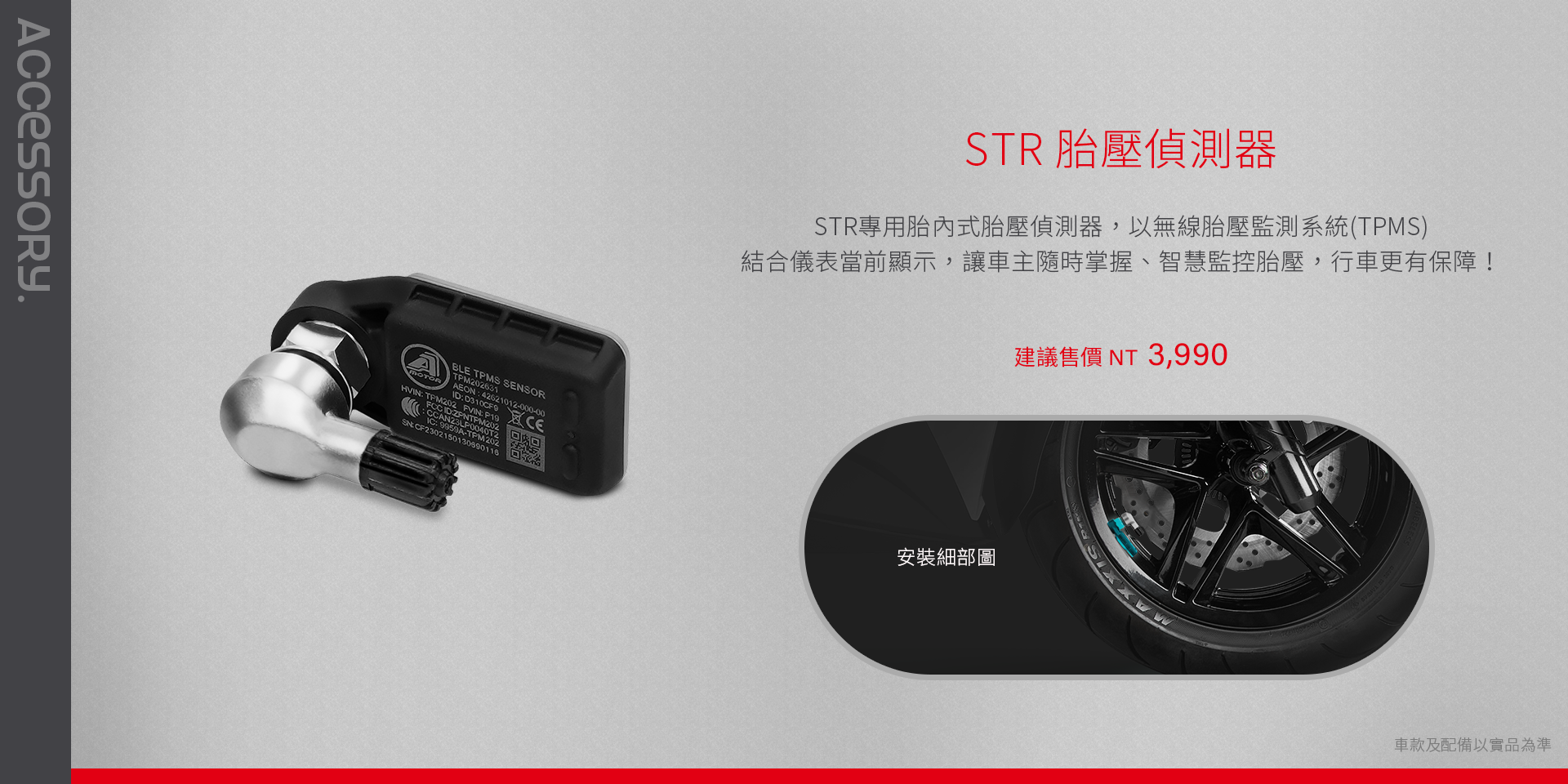 - 儀表顯示當前胎壓,行車有保障。 - 胎內式安裝,防盜又美觀。 - 自動休眠節電功能,延長使用壽命。 - 乙組產品即可同時偵測前、後輪胎壓,無須重複選購。 產地:台灣設計與製造 適用機種:STR 300、STR 250