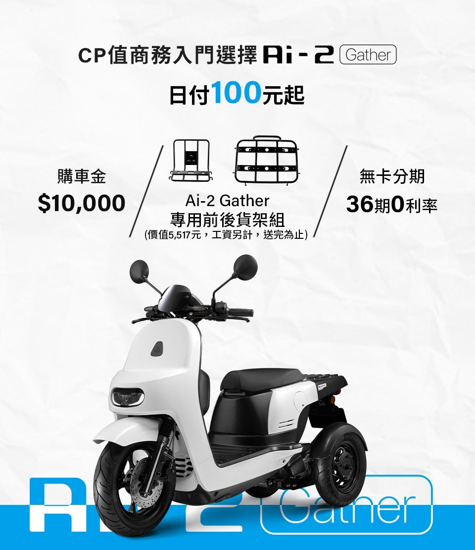 1. 參加人(須非法人或相關團體)於 2025年08月01日至2025年08月31日 (下稱「活動期間」),於 Aeontek門市或授權通路經銷門市,購買指定車款,付清全額車價(需於活動期間建立訂單並開立發票),Ai-2 Gather+可享「10,000元購車金」,Ai-2 Gather可享「10,000元購車金和Ai-2 Gather 專用前後貨架組乙組」