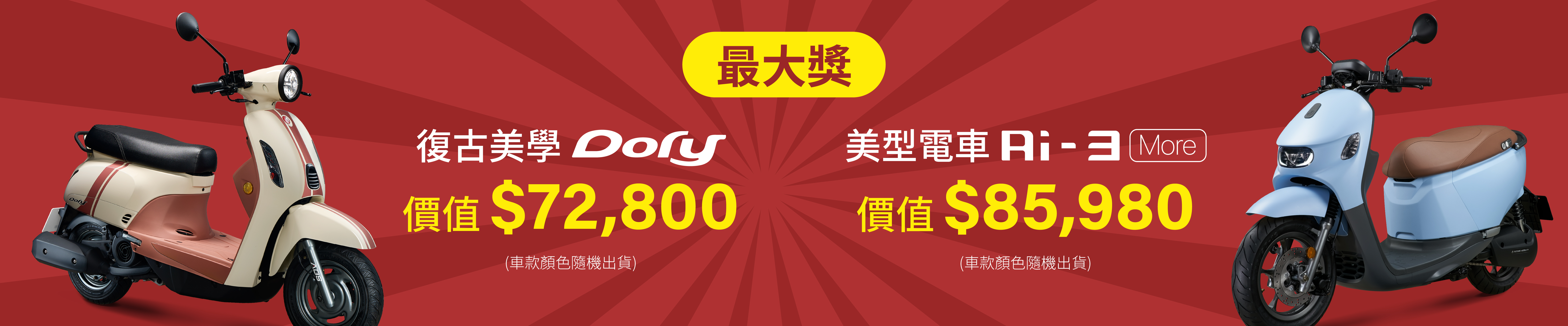 指定精品零件最低5折,還有機會把超人氣 Ai-3 More與Dory 125 ABS 騎回家!