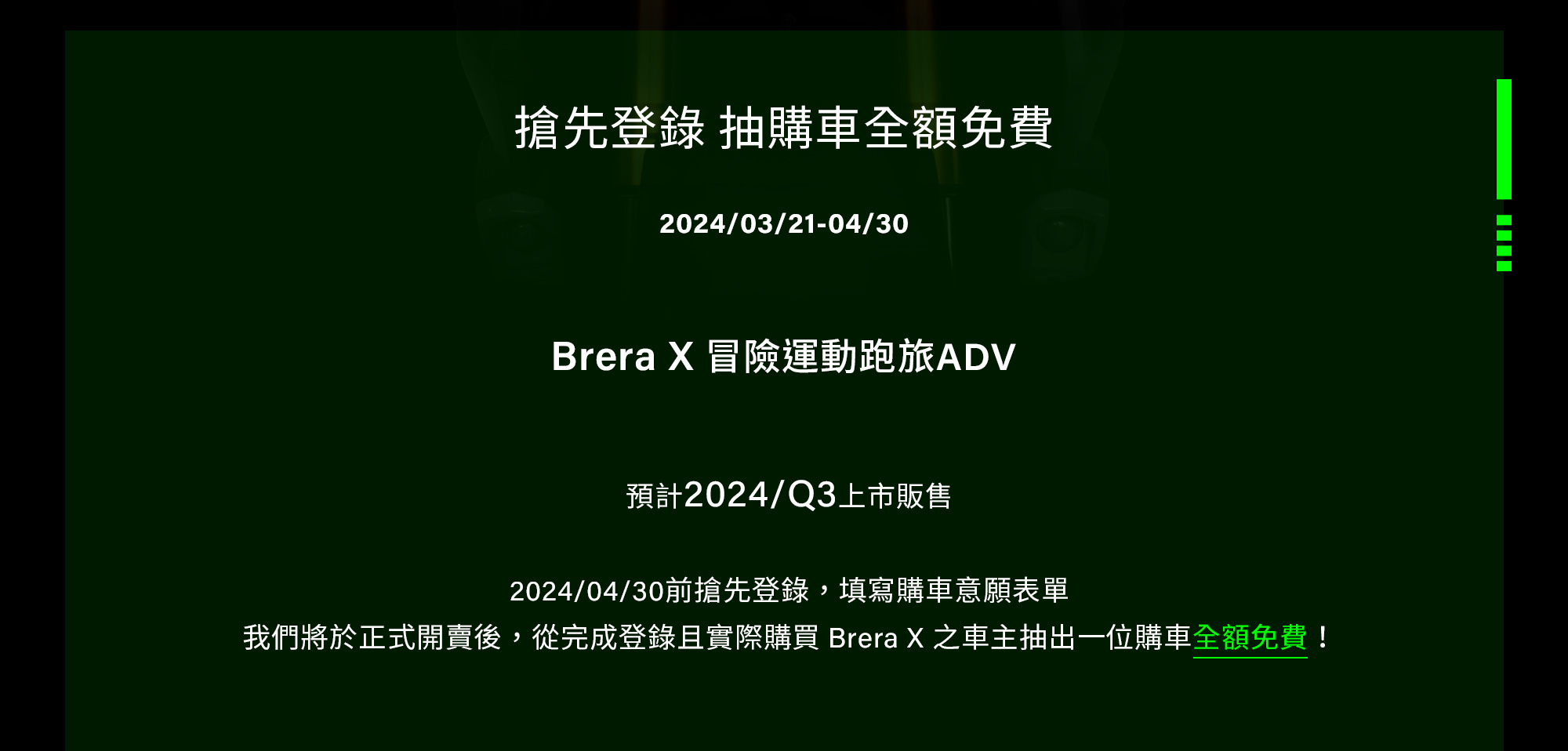1. 欲參加人(須非法人或相關團體)於2024/04/30前填寫完成購車意願表單,須於車款上市後在 Aeonmotor門市或授權通路經銷門市購買Brera X,並於正式交車後60天內完成交車程序,方可獲得抽獎資格。