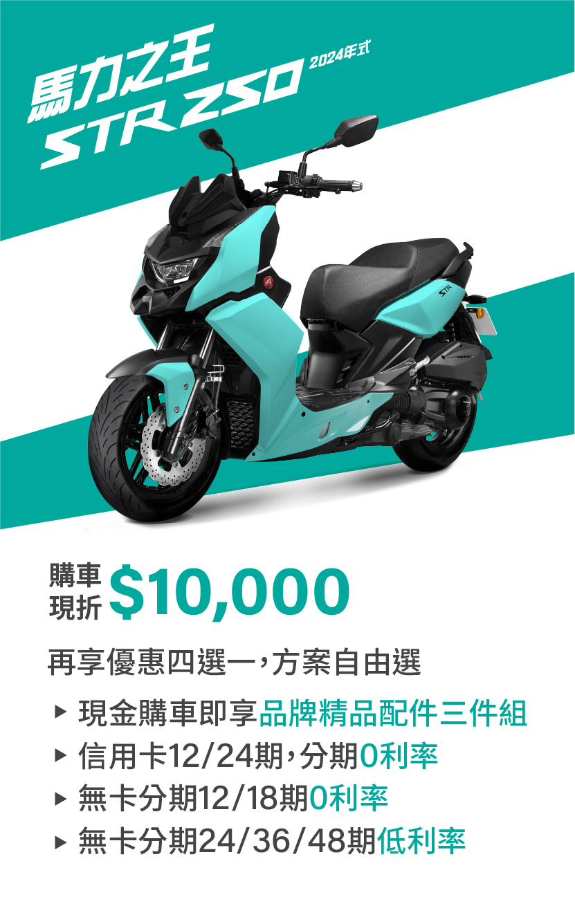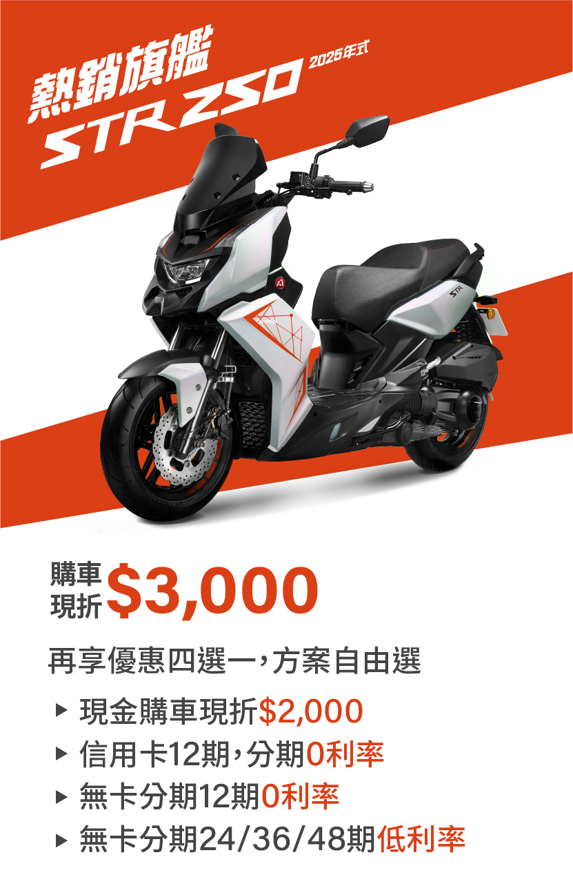 1. 2026/01/01-2026/01/31 (完成領牌),參加人(須非法人或相關團體)於 Aeontek門市或授權通路經銷門市,購買STR 250(24年式)/STR 250(25年式)/STR 300/STR 300 GT車款可獲得本專案優惠。