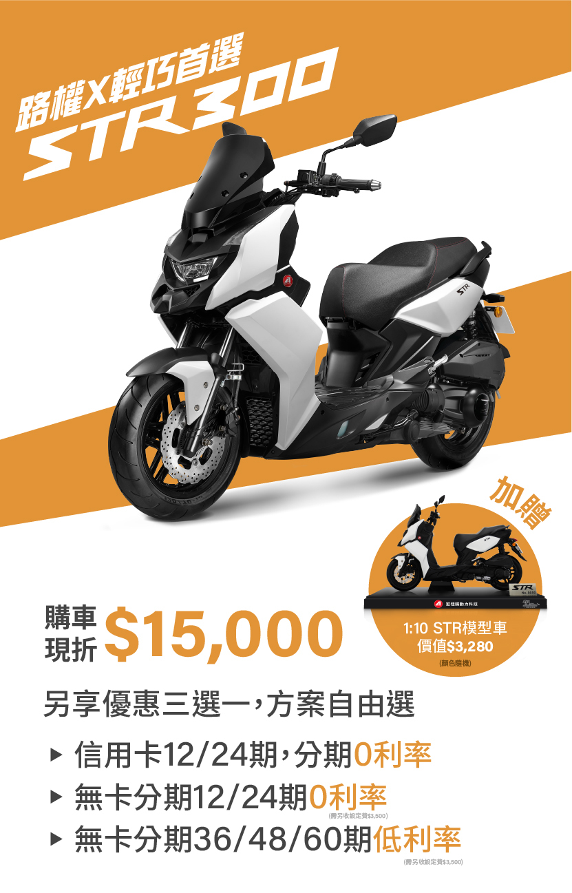 欲參加「STR 雙標自由,最高現折$15,000」」(下稱「本專案」)之消費者(下稱「參加人」)於參加之同時,即視為同意接受宏佳騰動力科技股份有限公司擬定之本注意事項之規範;如不同意本注意事項之全部或一部份,請勿參加本專案。