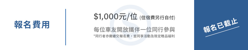 3.填寫報名表,並完成報名費繳交後,若無法參與活動,將不進行退費,亦無法要求更換為任何車輛服務、保養、精品等價交換。