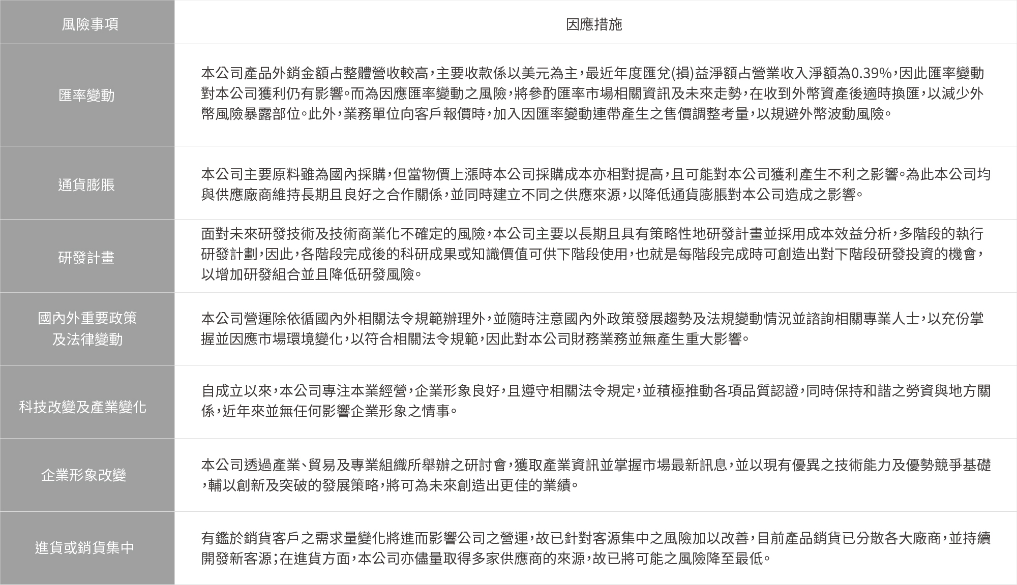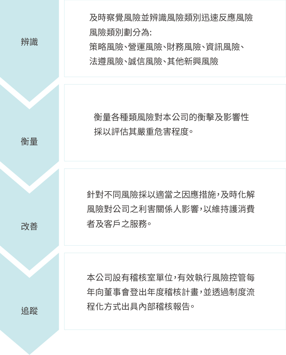 本公司之風險管理針對各單位潛在風險之認知、辨識、分析、衡量,進而選擇合適的方案加以控制、處理、監督並改進風險管理計劃,並依風險的特性與影響層級,予以集中管理與分層執行,使所有風險均能隨時有效掌控。本公司主要風險事項及因應措施如下: