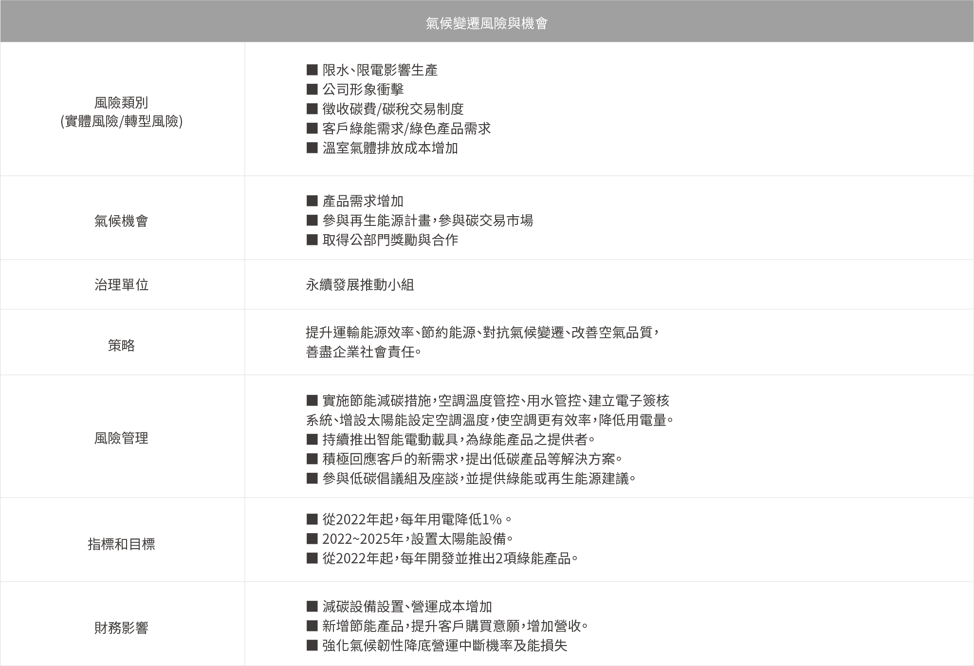 因全球暖化導致的極端氣候,以及近年來環保節能意識高漲,本公司需善盡其企業社會責任。為因應氣候變遷後所帶來之衝擊,公司內部不定期開會,討論如何應對氣候變遷風險與機會評估,更參考「氣候相關財務揭露建議(Task Force on Climate-related Financial Disclosures, TCFD)」,進行本公司對氣候相關風險與機會之管理與揭露。並依據評估結果後通過執行,期望減少能源消耗並降低碳排放,提升減碳管理績效,以落實企業永續發展之目標。本公司未來可能面臨的重大衝擊,及其因應對策請見下表。