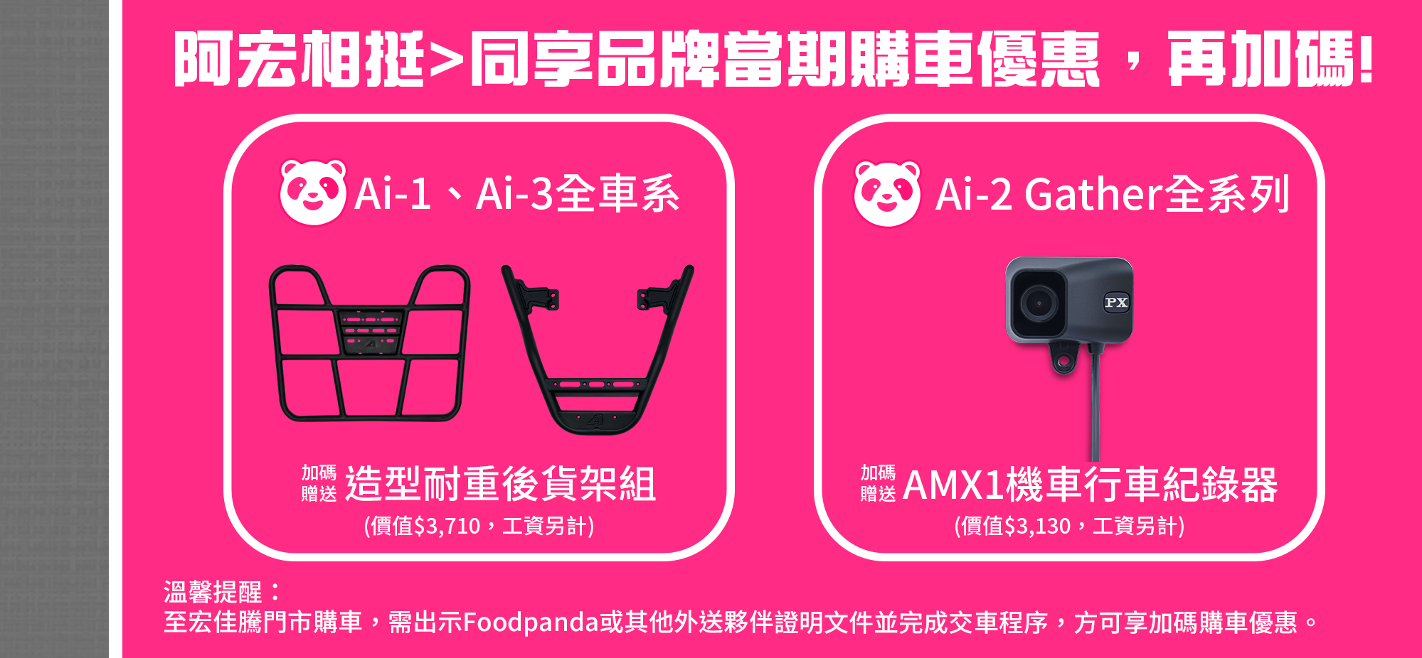 ● 購買Ai-1 Ultra Belt、Ai-1 Sport ABS、Ai-1 Sport+、Ai-3 Lite,或Ai-3 More系列任一車款,加碼獲贈「造型耐重後握把和耐重後貨架」乙組(工資另計)