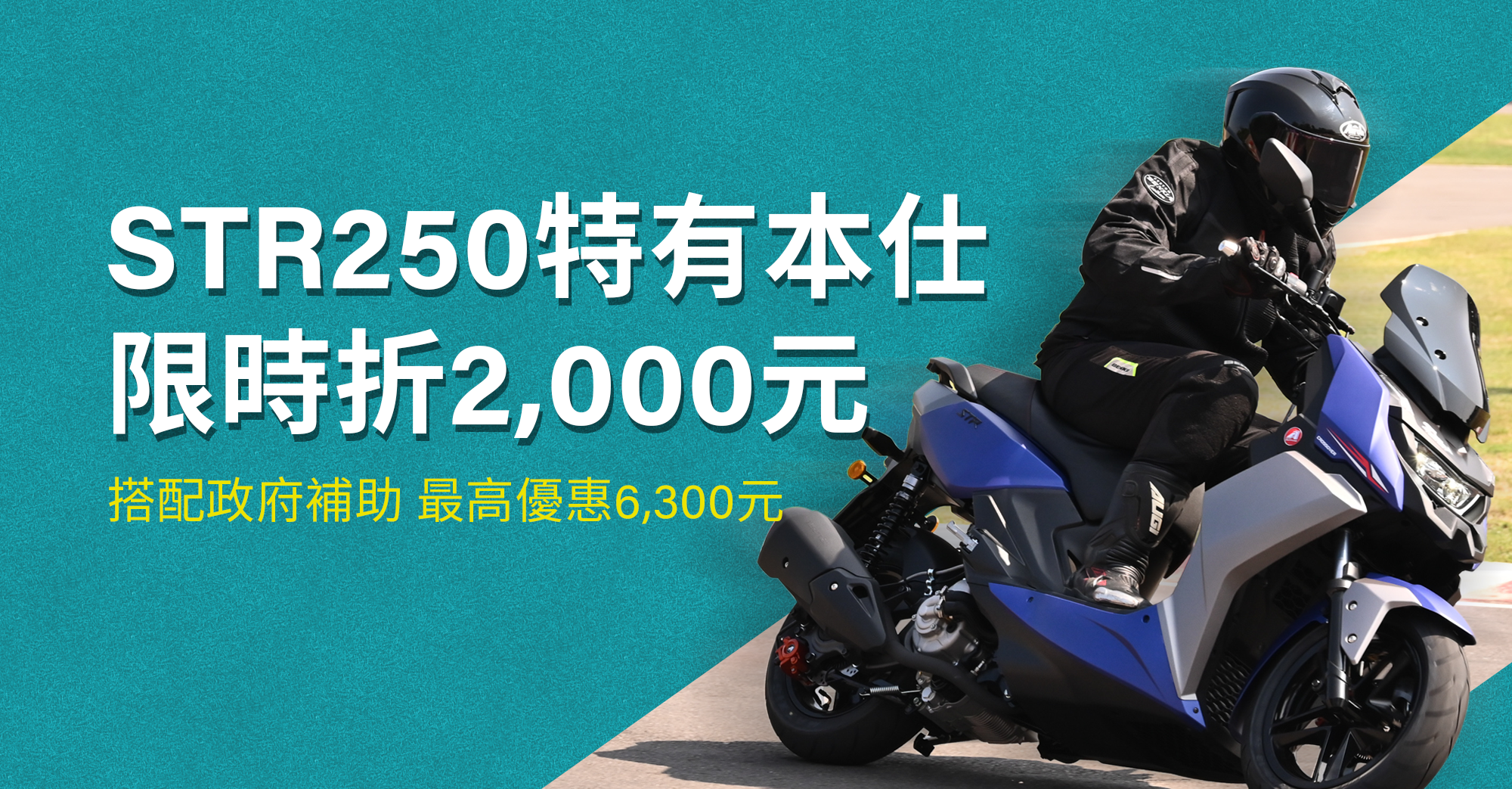 1. 即日起-2024/03/31,參加人(須非法人或相關團體)於 Aeonmotor門市或授權通路經銷門市,購買STR250特仕版車款可獲得本專案優惠。