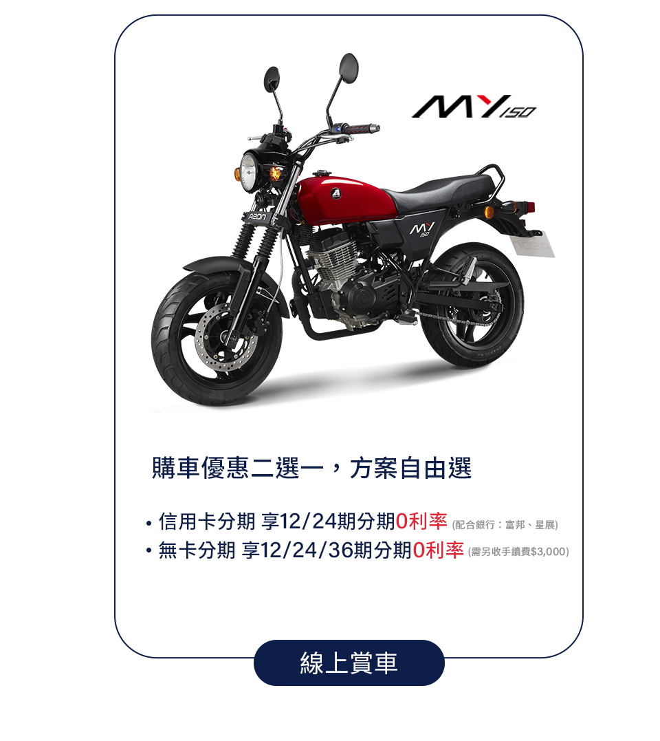 1. 即日起,參加人(須非法人或相關團體)於 Aeonmotor門市或授權通路經銷門市,購買MY150車系車款可獲得本專案優惠。