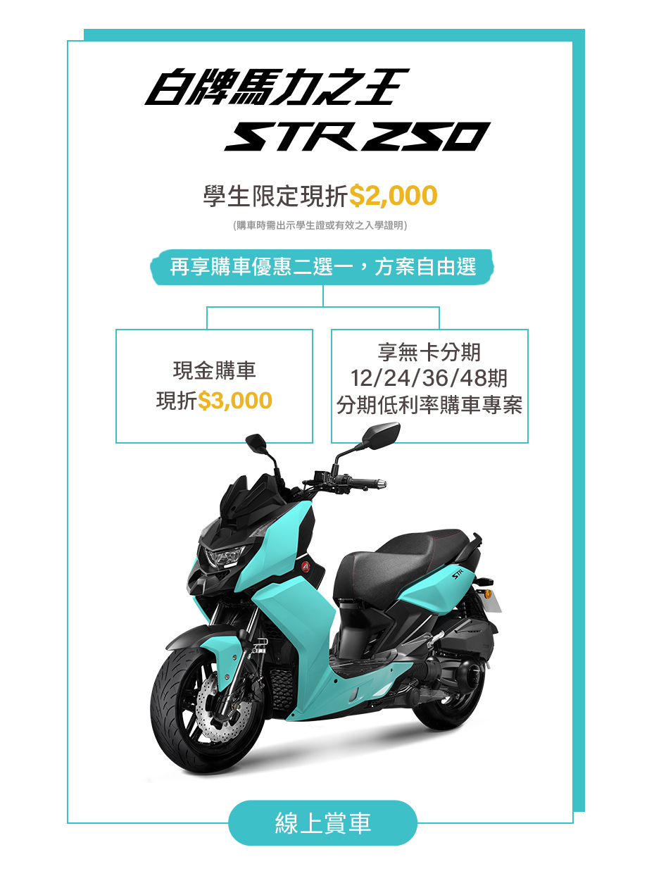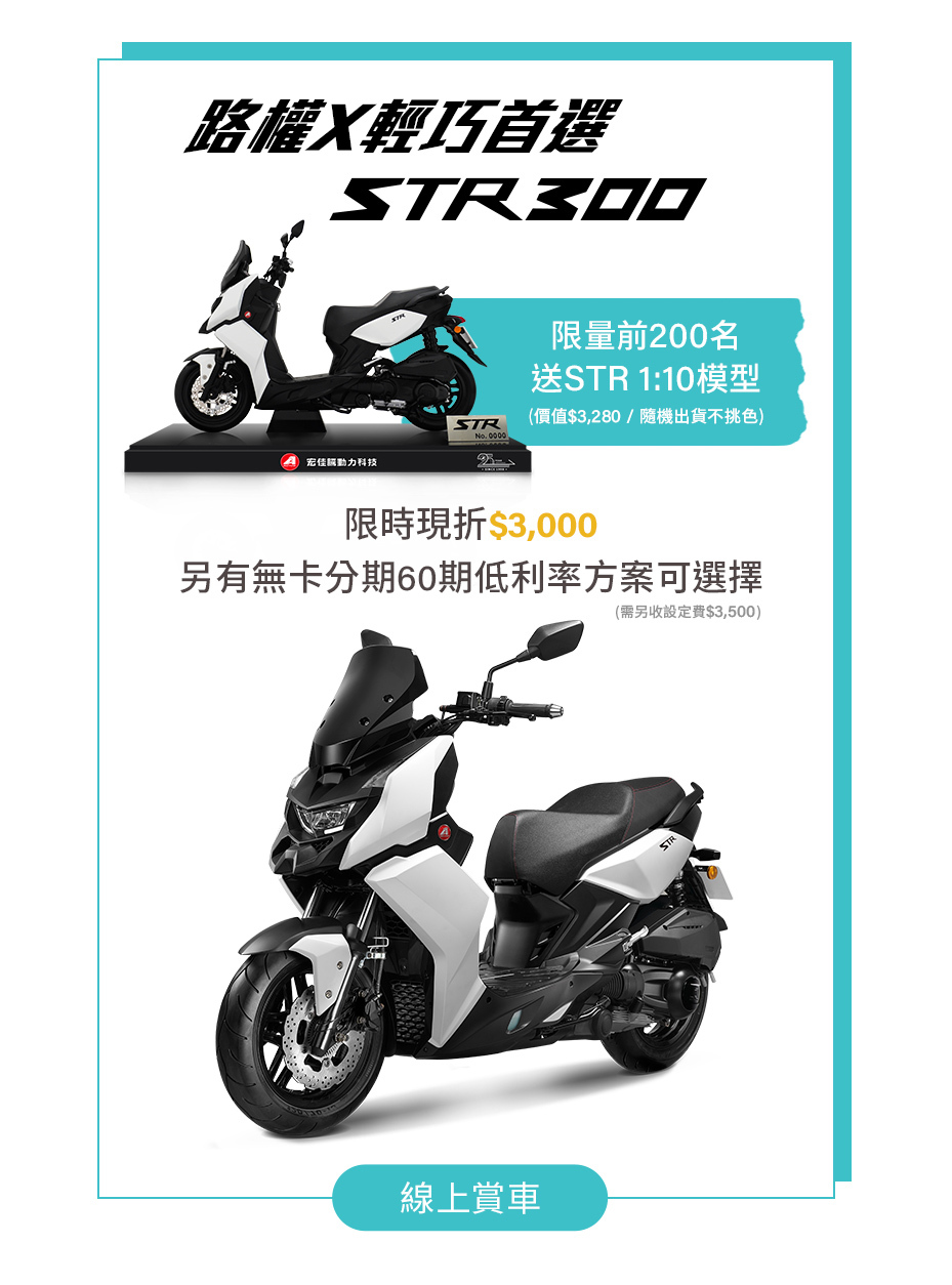 1. 即日起-2024/08/31,參加人(須非法人或相關團體)於 Aeonmotor門市或授權通路經銷門市,購買STR250/STR300車款可獲得本專案優惠。