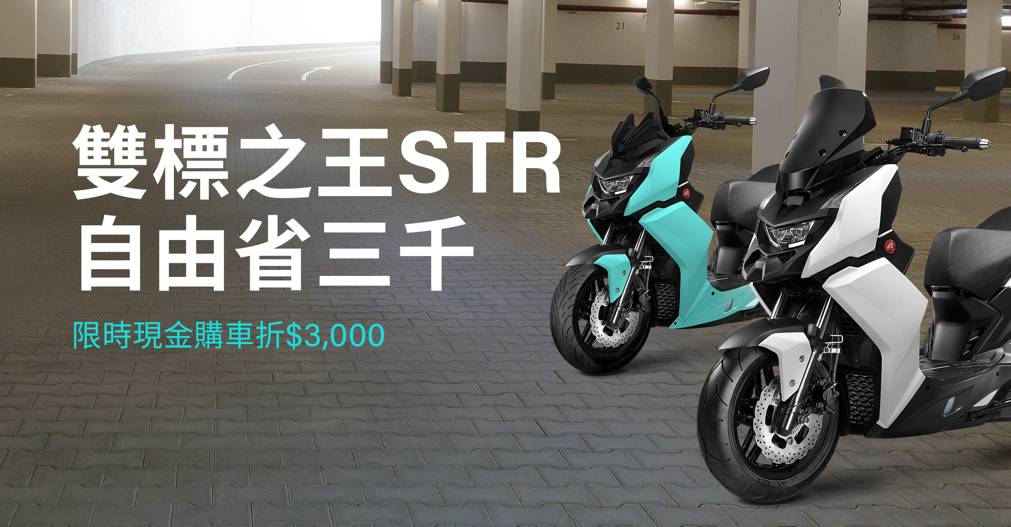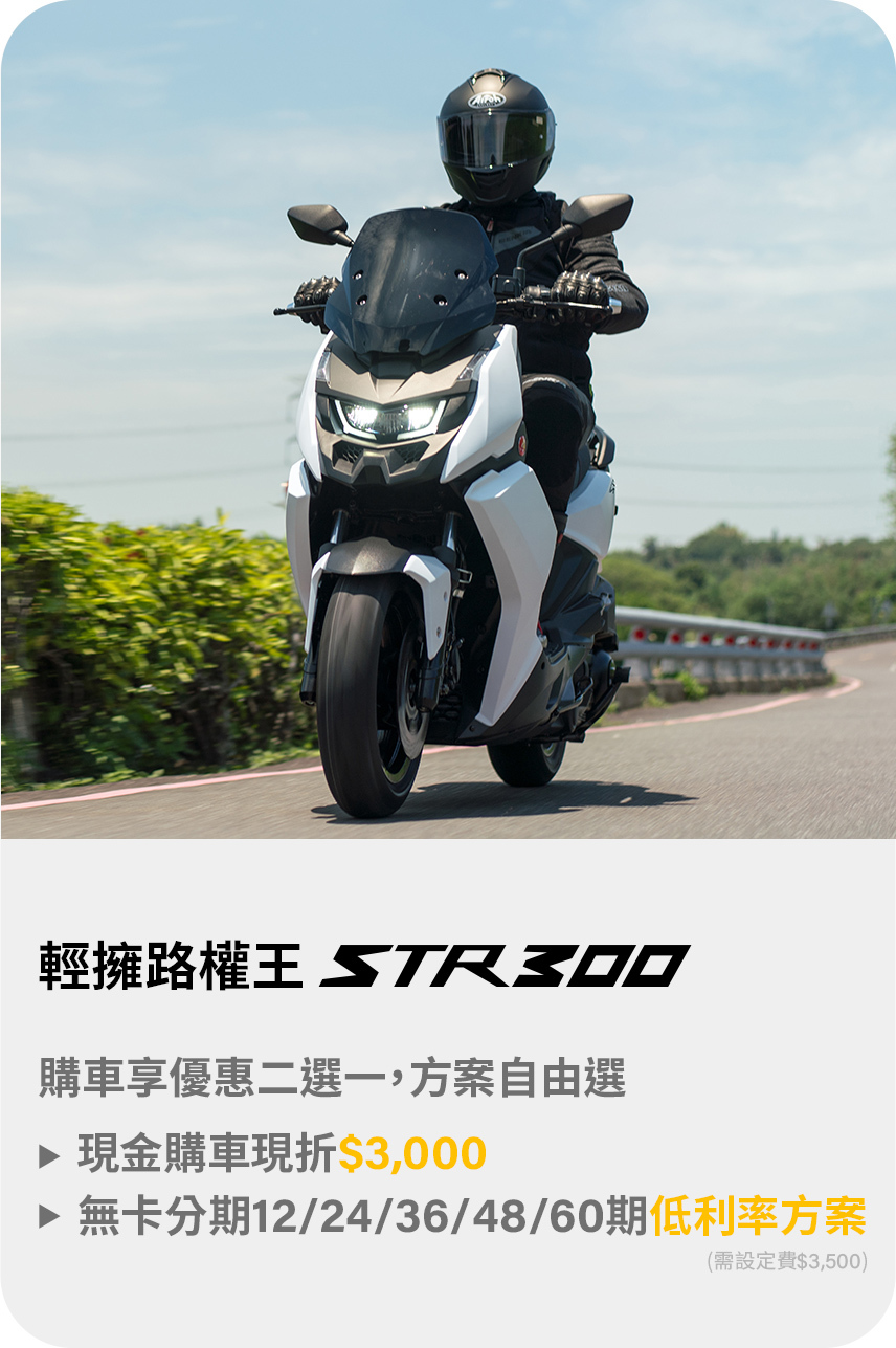 1. 即日起-2024/12/31,參加人(須非法人或相關團體)於 Aeonmotor門市或授權通路經銷門市,購買STR250/STR300車款可獲得本專案優惠。