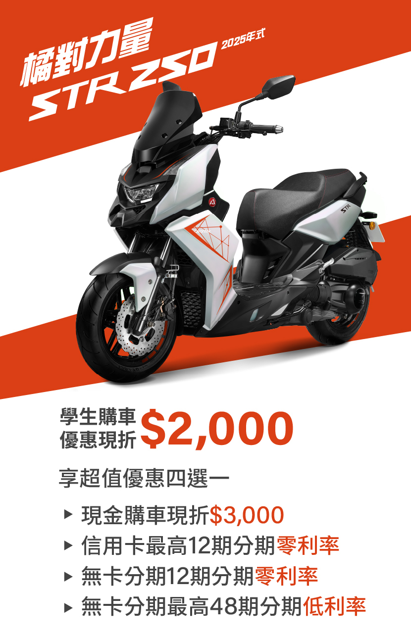 1. 2025/8/1-2025/8/31(完成領牌),參加人(須非法人或相關團體)於 Aeontek門市或授權通路經銷門市,購買STR250(24年式)/STR250(25年式)/STR300/STR 300 GT車款可獲得本專案優惠。
