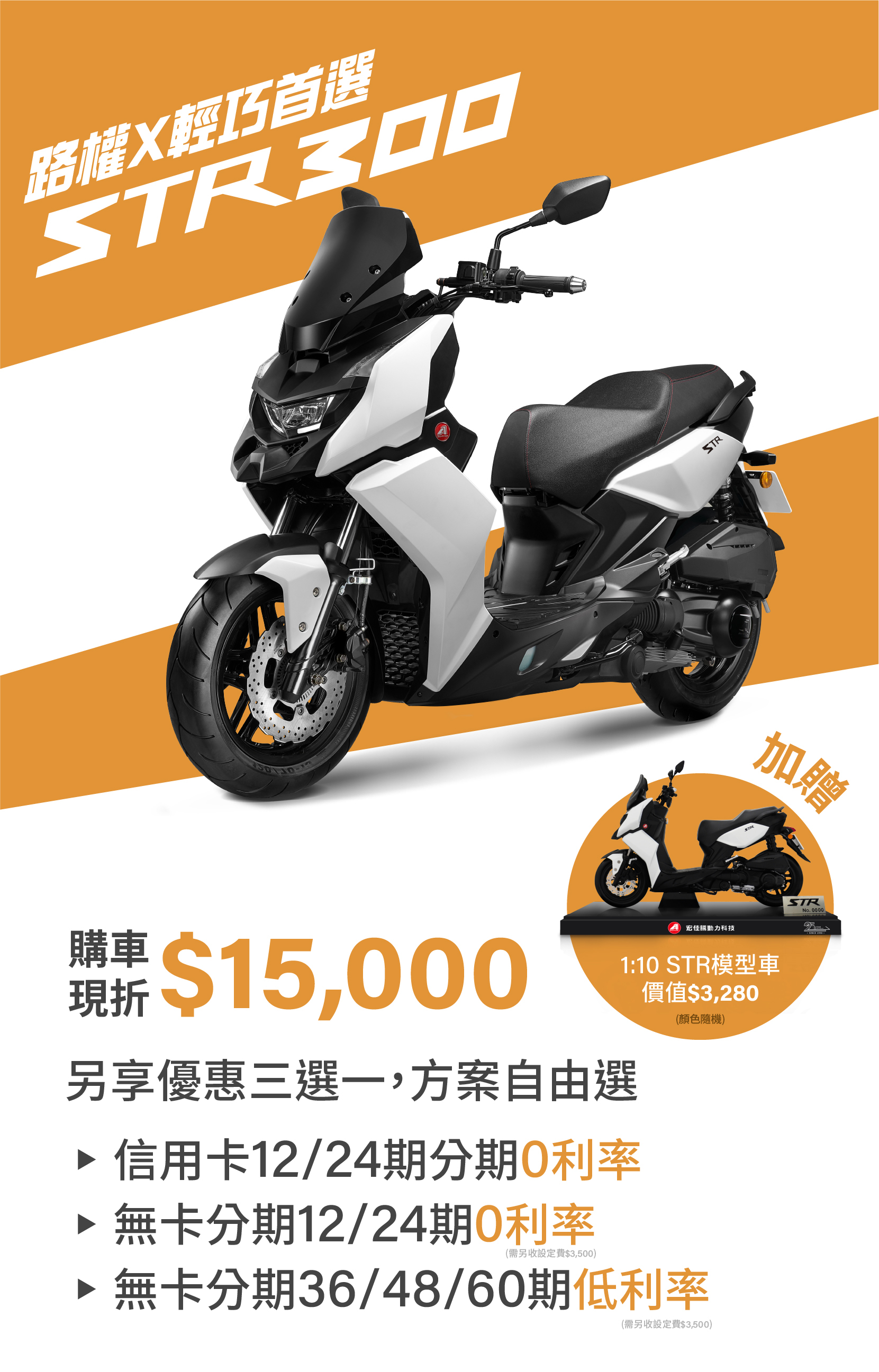 欲參加「STR 雙標首選,最高現折$15,000」(下稱「本專案」)之消費者(下稱「參加人」)於參加之同時,即視為同意接受宏佳騰動力科技股份有限公司擬定之本注意事項之規範;如不同意本注意事項之全部或一部份,請勿參加本專案。