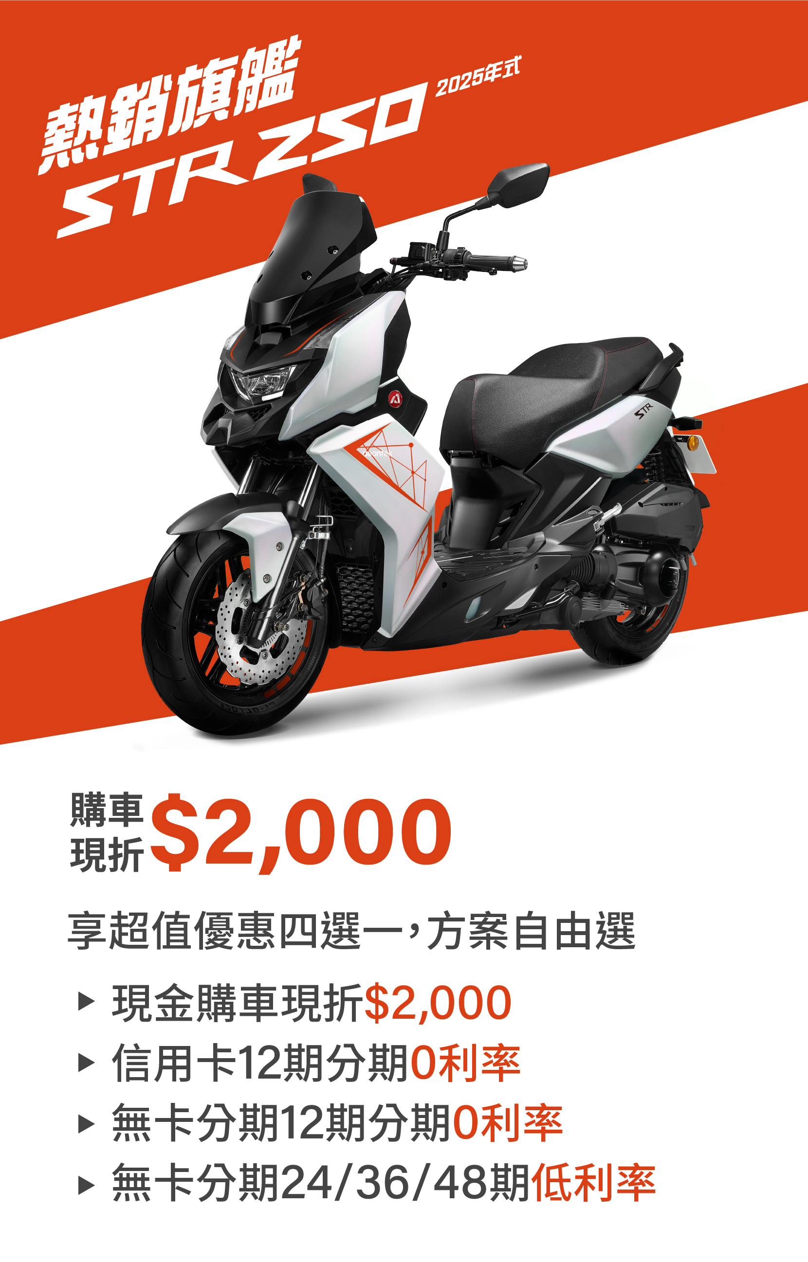 1. 2025/10/1-2025/11/30(完成領牌),參加人(須非法人或相關團體)於 Aeontek門市或授權通路經銷門市,購買STR250(24年式)/STR250(25年式)/STR300/STR 300 GT車款可獲得本專案優惠。