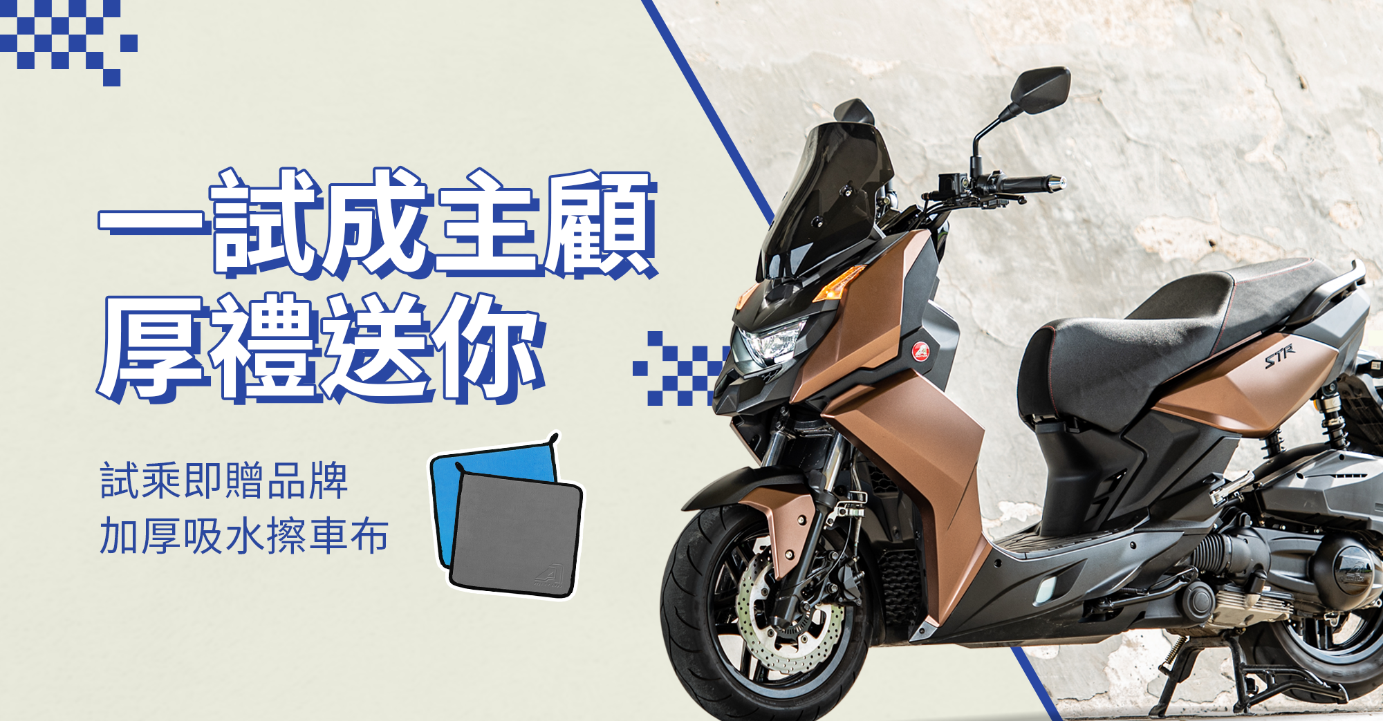 至全台宏佳騰機車指定經銷門市體驗試乘,並填寫試乘問卷,即可獲得「品牌加厚吸水擦車布」